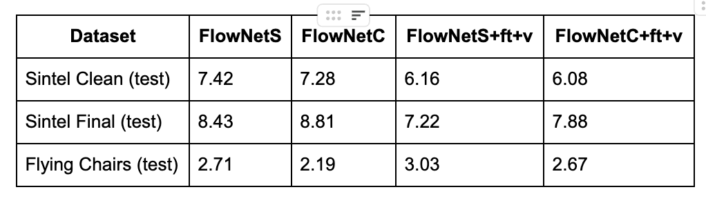 FlowNet: According to the paper on FlowNet, “The endpoint error (EPE), which is the standard error measure for optical flow estimation. It is the Euclidean distance between the predicted flow vector and the ground truth, averaged over all pixels.” This is how the FlowNet Models were evaluated on different datasets, with the lower EPE value the better. All of these models did very well on the Flying Chairs dataset, likely because it is a simpler dataset and that is also what the models were trained on, and had a harder time with the Sintel dataset. The Sintel dataset was made of animated images, with the Clean dataset being ones that were just straight-forward images, and Final having tougher things like motion blur and other blemishes on the image that make it tougher to identify correlating pixels. However, in the models including +ft, we did see a slightly better performance. This makes sense as these models were finetuned with the Sintel dataset, compared to their counterparts (that didn’t include +ft) that had a worse performance, as they didn’t have the fine tuning. A main reason for the training being purely on the Flying Chairs dataset is because of how many samples are located within it, around 23,000, compared to Sintel which only contained around 1000 image pairings.