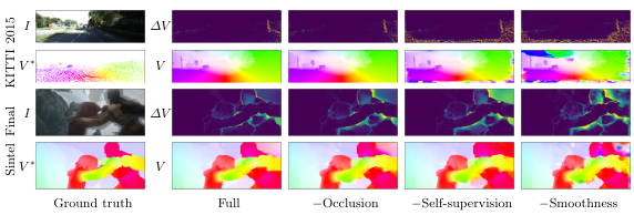 Figure 12. A visual comparison of how ablating each individual component, while holding the others constant, impacts the results. Examples from both KITTI and SINTEL shown. [3].