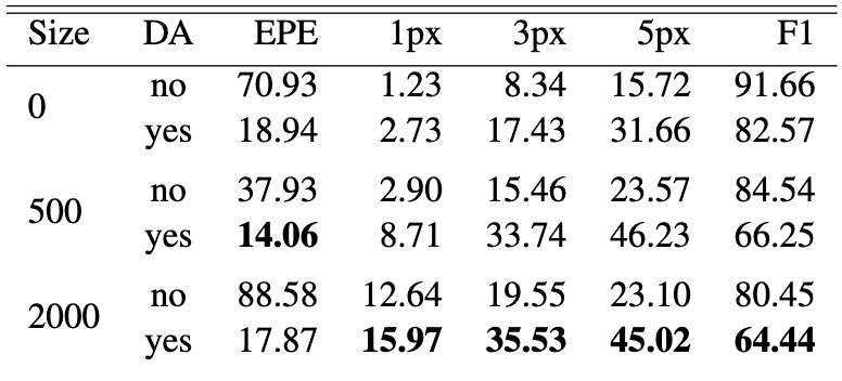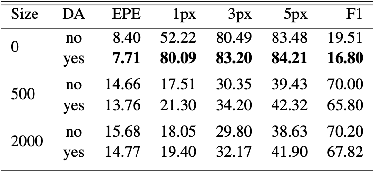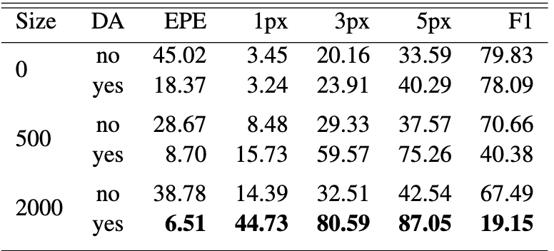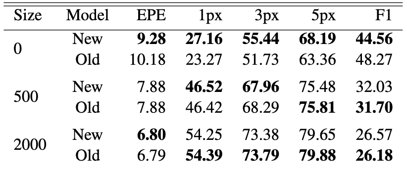 Figure 8. RAFT performance on Sintel and KITTI, displaying metrics after fine-tuning under different data conditions [2].