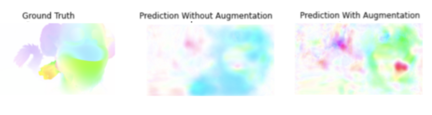 The experiments compared FlowNet, the modified FlowNet with deconvolutional upsampling (DU), and RAFT-S across different amounts of pre-training data (0, 500, and 2000 Flying Chairs pairs) and with or without data augmentation. All models were fine-tuned on 520 Sintel image pairs and evaluated on both Sintel and KITTI. Overall, the results showed that dataset size and augmentation played a major role in model performance, especially in low-data settings, and that RAFT benefited significantly more from augmentations than FlowNet.