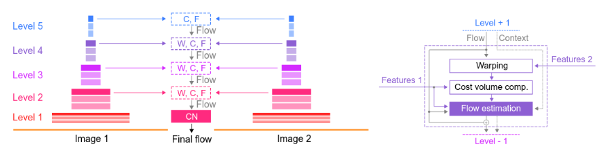 The underlying architecture that UFlow is based on is the PWC-Net, which is then improved upon to determine the most important components. Because the pyramid, warping, and cost (PWC) approach was initially intended for supervised learning, adjustments had to be made during the creation of the UFlow model. For example, the highest pyramid level was removed to decrease the model size and dropout was incorporated for additional regularization.