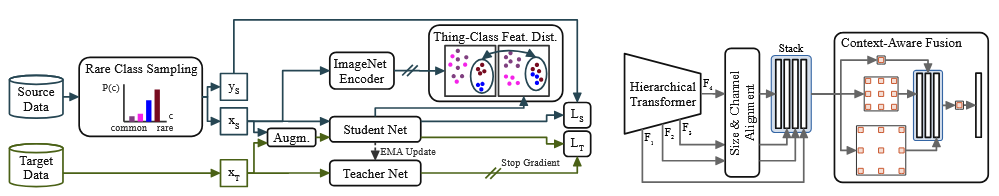\[L_{\text{T-CIFD}} = \frac{1}{|C_{\text{thing}}|} \sum_{c \in C_{\text{thing}}} \left\| \mu(F_c^{\text{source}}) - \mu(F_c^{\text{target}}) \right\|_2^2\]where \(C_{\text{thing}}\) is the set of thing classes, and \(\mu(F_c)\) denotes the mean feature vector of all pixels belonging to class \(c\). This constraint prevents the feature extractor from drastically altering learned object representations, while still allowing “stuff” classes (e.g., road, sky) to adapt flexibly to the target domain.