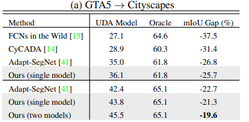 Table 2: Comparison of mean IoU and oracle performance for unsupervised domain adaptation from GTA5 to Cityscapes. ADVENT improves segmentation performance over prior methods 3