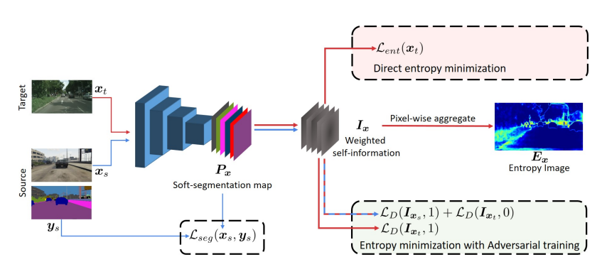 While the performance of CyCADA receives a 39.5 mIoU, the computation done to modify the source domain to the target domain’s statistics before being classified is an image-to-image transformation. Recognizing these limitations, subsequent research shifted focus from modifying the input features to regularizing the model’s output. This evolution led to ADVENT, a method that eschews style transfer entirely and instead leverages the adversarial principle to enforce confidence by minimizing prediction entropy in the target domain’s output space.