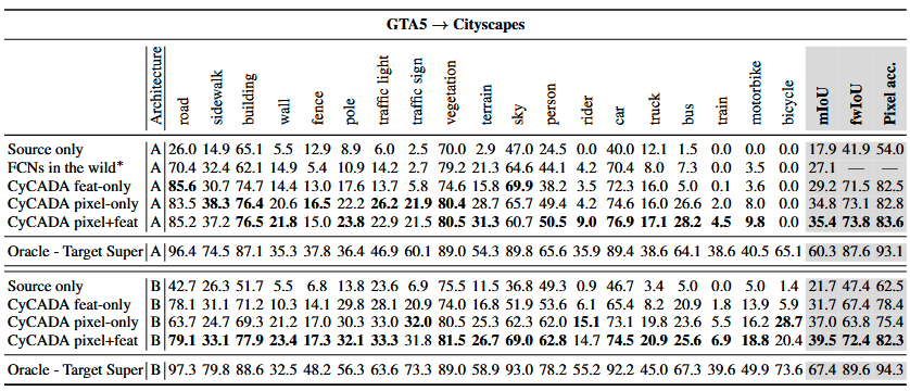 Table 1: Per-class IoU, mean IoU, and pixel accuracy for adaptation from GTA5 to Cityscapes. CyCADA significantly outperforms source-only baselines across architectures 2